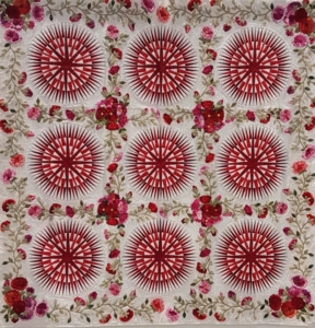 Voor de liefhebbers van traditionele quilts viel er veel te genieten op het Festival of Quilts dit jaar. De Italiaanse inzending is op een heel andere wijze interessant. De quilt bestaat uit 9 blokken met het patroon Mariners compass en op de sashings zijn prachtige bloemen geappliqueerd. Een combinatie die je niet vaak ziet en geheel in rood-wit uitgevoerd.
