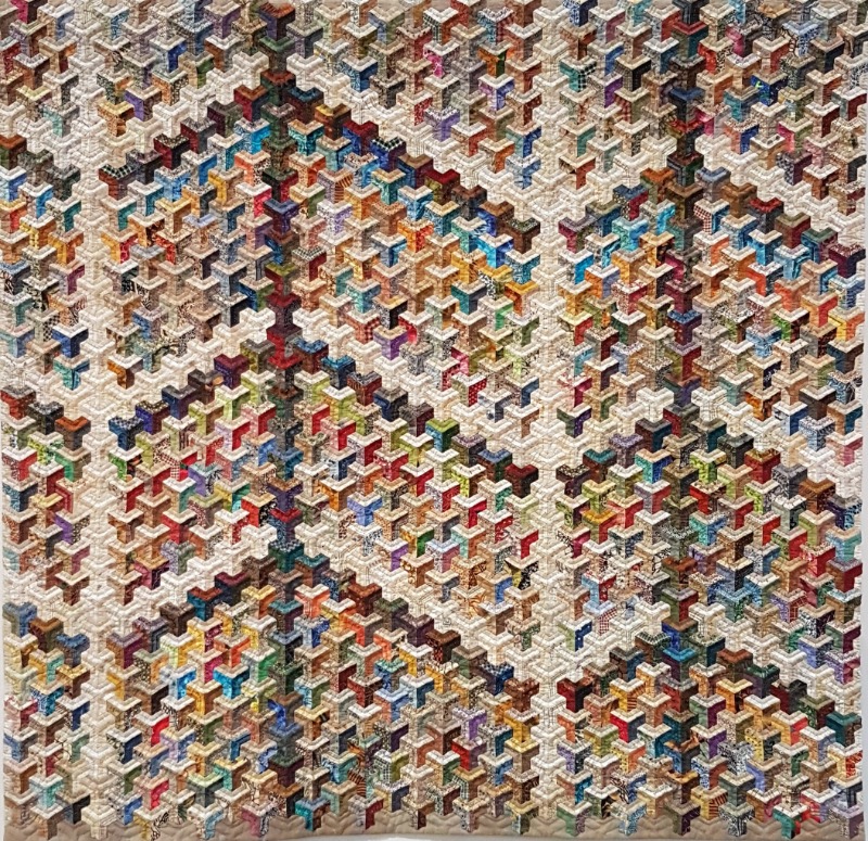 In een eerder blog vertelde ik dat voor Nederland de quilt Bubbles of Joy van Anne Lillholm werd geselecteerd. Dat is een hele moderne quilt maar er waren ook enkele echt traditionele quilts te bewonderen. De inzending uit België bestond uit meer dan 5500 stukjes die met de hand aan elkaar waren gezet tot hexagonen en daarna in een soort ‘Inner city’ patroon. Drie lagen, traditionele stofjes met de hand in elkaar gezet en op de hand gequilt. De quilt voldoet volledig aan de kenmerken van een traditionele quilt en heeft een sterke uitstraling door de plaatsing van de kleuren.