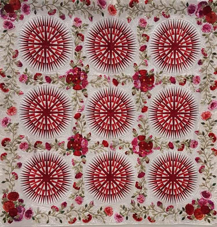 Voor de liefhebbers van traditionele quilts viel er veel te genieten op het Festival of Quilts dit jaar. De Italiaanse inzending is op een heel andere wijze interessant. De quilt bestaat uit 9 blokken met het patroon Mariners compass en op de sashings zijn prachtige bloemen geappliqueerd. Een combinatie die je niet vaak ziet en geheel in rood-wit uitgevoerd.