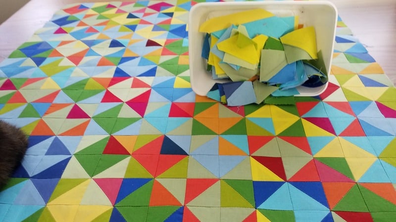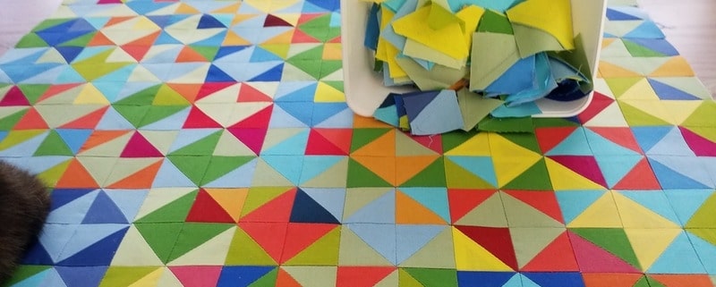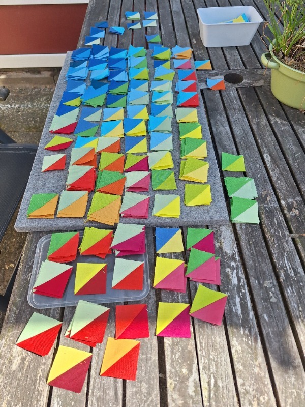 En dus ga ook ik aan de slag. Ik kies 12 projecten die ik graag af zou willen maken. Enkele zijn alleen blokken, andere al klaar als top en ook een doosje met HST (half square triangles) als ‘afval’ van een ander project liggen genummerd kaar. In een boekje noteer ik welk project daarbij hoort en ik ga aan de slag. Ik heb met mijzelf afgesproken dat ik na ieder nieuw/afgemaakt project een nummer uit de hoge hoed trek en dat wordt het project waar ik mee aan de slag ga. Momenteel is dat de resten van mijn temperatuur quilt.