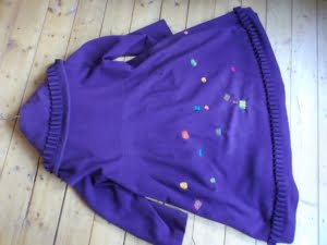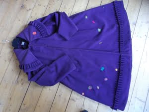 Dat was de oplossing. Alle gaatjes in mijn jas heb ik weggewerkt onder een stukje vrolijk gekleurd stopwerk. En om dat niet als een losstaand iets te laten heb ik er nog meer stopplekken bijgemaakt. Zodat er een soort baan over mijn jas loopt. Een heel vrolijke jas is het nu geworden.