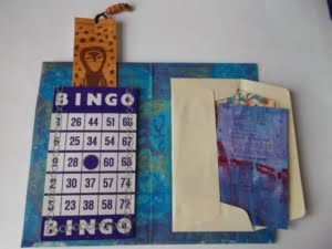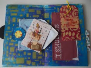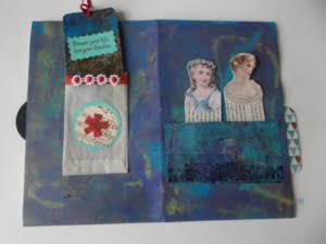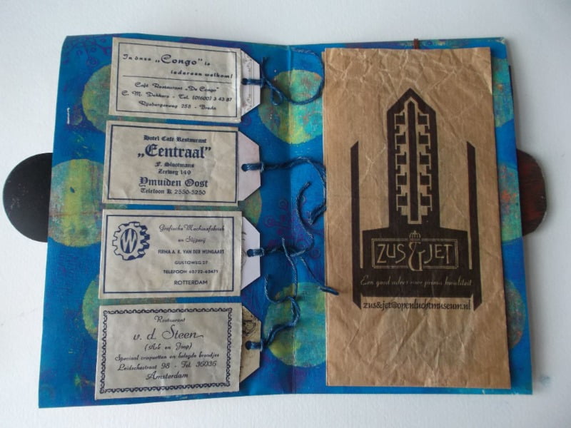 De omslag is van een kartonnen doos en de pagina’s van oude enveloppen. Op die pagina’s zitten ook weer enveloppen en andere “mapjes” waar dus allerlei verrassingen in zitten.