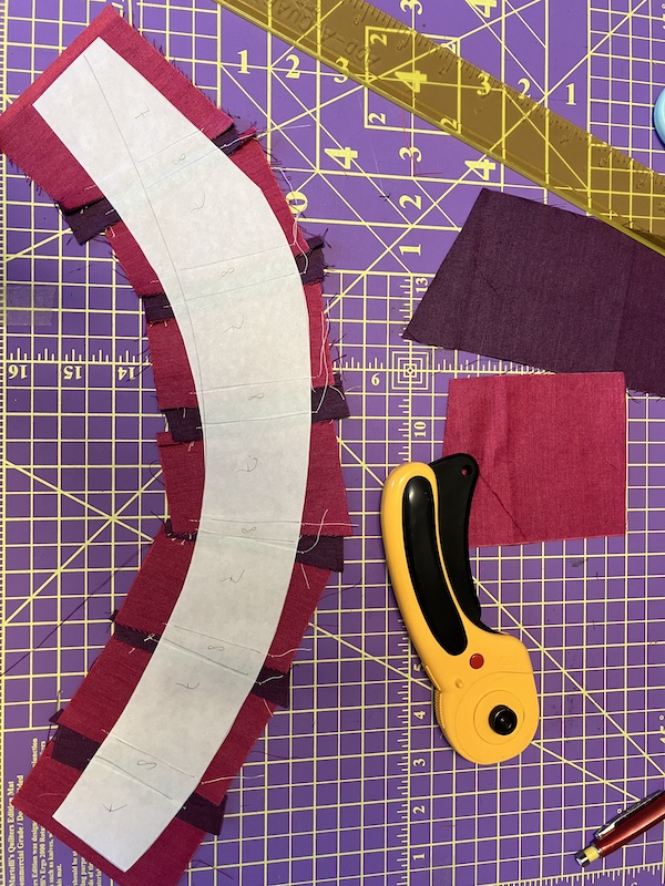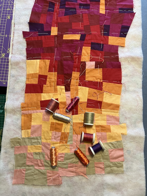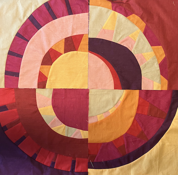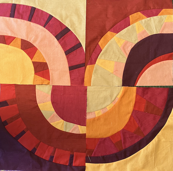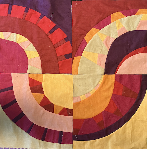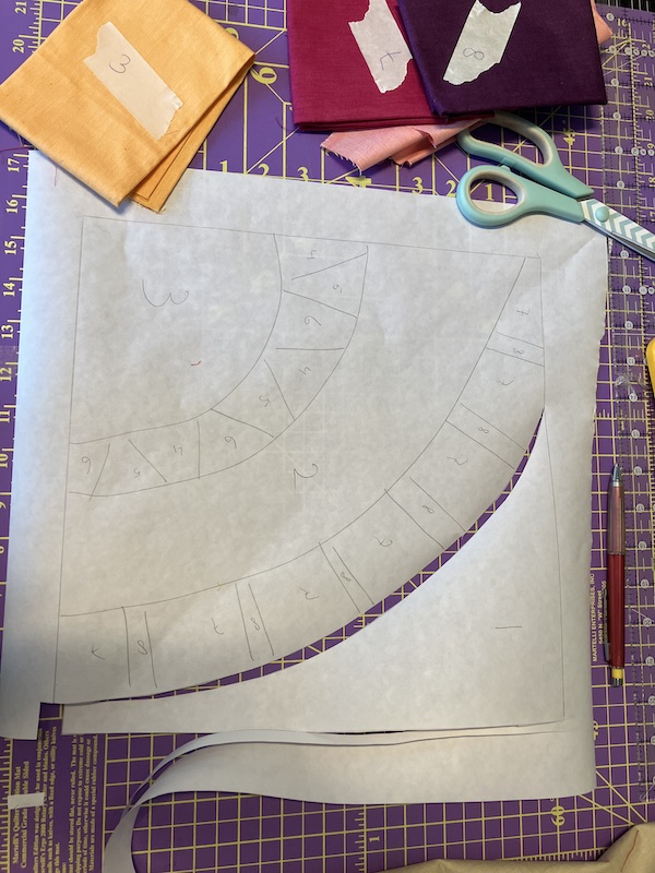 Ik volgde twee online lessen van Jo Avery tijdens de ‘corona’ Quiltcon. Ik hou van de vrije manier waarop ze werkt. Weinig gebruik van linialen, daardoor een los en natuurlijk verloop van de naden. Met behulp van Freezer paper maak je een ontwerp en dan gebruik je dat als patroon voor het paper piecen. Je stikt net langs het papier, dus dat kun je nog een keer gebruiken voor een ander blok. Als je nog nooit met behulp van freezer papier gewerkt hebt is het echt het proberen waard. Voordeel is ook dat je het freezer papier niet hoeft los te peuteren zoals bij het gebruik van ‘de gewone papier methode’ omdat je hier naast het papier stikt.