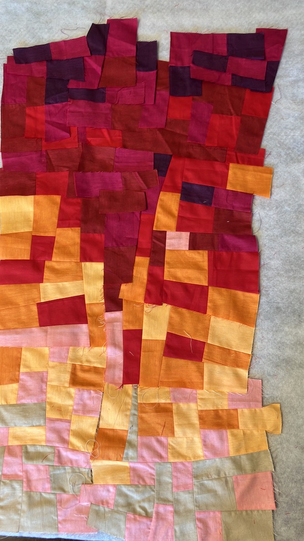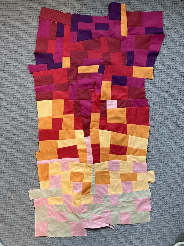 De vier blokken zijn van dezelfde stoffen gemaakt als die ik voor de bovenstaande top van Carolina Oneto heb gebruikt. De acht verschillende tinten heb ik vrij over de vier blokken verdeeld. Niet te veel nadenken, dat is mijn motto!