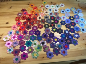 Een ideale bezigheid om die hoeveelheid aan reststofjes te verwerken tot vrolijke bloemen; het is een leuk klusje voor onderweg in de trein, of als je elders bent. Gestaag groeit mijn voorraad bloemen. Maar ja, vraag je je dan af, hoeveel heb je er nodig voor iets aardigs en wat kan/ zal ik ervan maken?