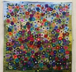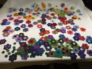 Uiteindelijk dit voorjaar, bij het voornemen toch maar eens wat van die oude projecten af te ronden, na zeker twee jaar stilstand, ook deze quilt maar weer opgepakt. Je kijkt dan weer even met een frisse blik naar het voorliggende resultaat. Dat betekende eerst wat uithalen, teveel van dezelfde tussen kleur! Daarna ieder moment van even rusten toch weer wat hexjes en bloemen aan elkaar zetten. De aanmoediging van mijn buren, die af en toe naar dat monnikenwerk kwamen kijken, scheelde ook om door te zetten. Natuurlijk er ook nog wat bloemen bij maken want ik had kleurige restjes stof gehad en dat paste er nog prima bij.