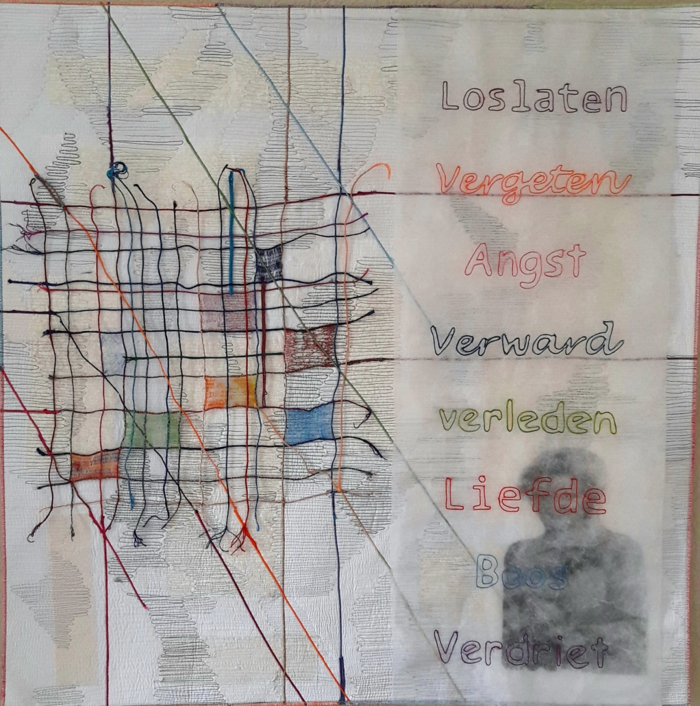 “Het was erg leuk om met iemand te werken die je niet kent en die een traditionele quilter is. Ik herkende de worsteling met het materiaal, het te veel willen. We hebben via de mail gecommuniceerd en elkaar nog niet ontmoet. Mijn eigen werkroutine moest ik door dit project wel loslaten want ik moest een voorbeeld maken. Dat is niet zo mijn ding, vaak groeit een quilt onder mijn handen. Het met elkaar meekijken was leuk, vooral het nadenken over beelden bij de tekst. Lies had een goede suggestie bij mijn tekst en die heb ik overgenomen: de vlieger. De materialen en werkwijze waren voor Lies wel eens een bron van vragen. Ik heb gewerkt met een thermoprint, eco-printen en in wateroplosbaar vlies.”