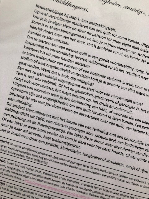 Vanuit Joke/Liesbeth kregen we elke week een mail met daarin achtergrondinformatie en vragen. De informatie en vragen die bijv. bij stap 1. hoorden gingen met name over hoe kom je tot de keuze van welke tekst je gaat gebruiken voor jouw project. De vragen zetten je aan om dieper na te denken over het “waarom” van jouw keuze. De antwoorden op de vragen zette je op papier en stuurde je naar je quiltmaatje. Zij las de antwoorden en gaf feedback en stuurde die terug. Door zo met elkaar te communiceren kon je een weloverwogen keuze maken en kreeg je steeds meer feeling met jouw gekozen tekst.