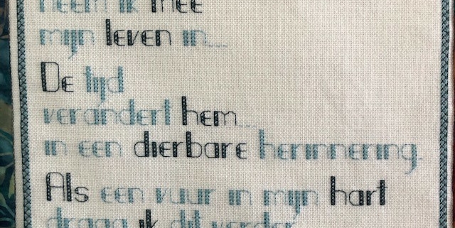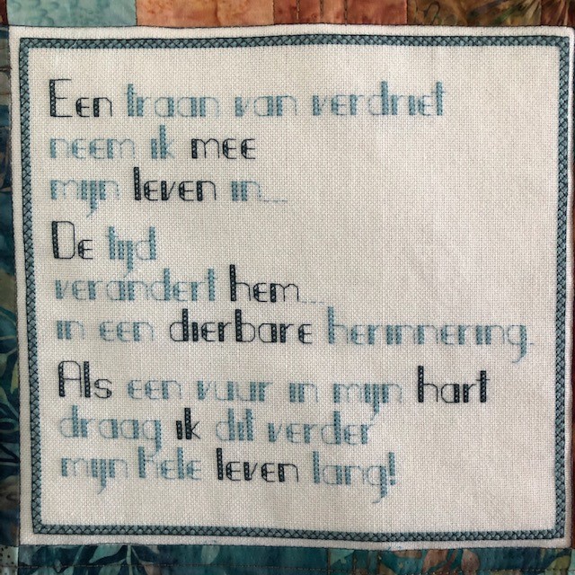Enthousiast als ik ben ging ik van start. Hoe mooi en interessant is het om dat hele proces voorafgaand aan het daadwerkelijk aan de slag gaan met stofjes, naald en draad te doormaken, doorleven, doorvoelen. Met anderen die ik niet ken (en zij mij ook niet) en dus een andere manier van werken hebben, samen aan de slag te gaan om tot een mooi eindresultaat te komen. En doordat je alleen contact hebt via de mail kun je aan de slag in je eigen huis, je eigen werkruimte welke jou vertrouwd is. Want ja, met mijn gekozen tekst stelde ik mij kwetsbaar op. Het was een zeer persoonlijke tekst en hoe daar door anderen op gereageerd zal worden kan moeilijk zijn. Maar mijn wil om de tekst om te zetten in beeld was groot, dus ik ging de uitdaging aan.