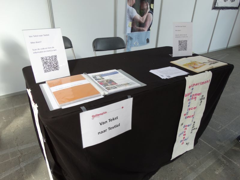 Wij stonden daar om het nieuwe project “van Tekst naar Textiel” van het Quiltersgilde te promoten. Om op te vallen en meteen een gesprek te hebben hadden we schorten gemaakt met teksten op ons lijf geschreven.