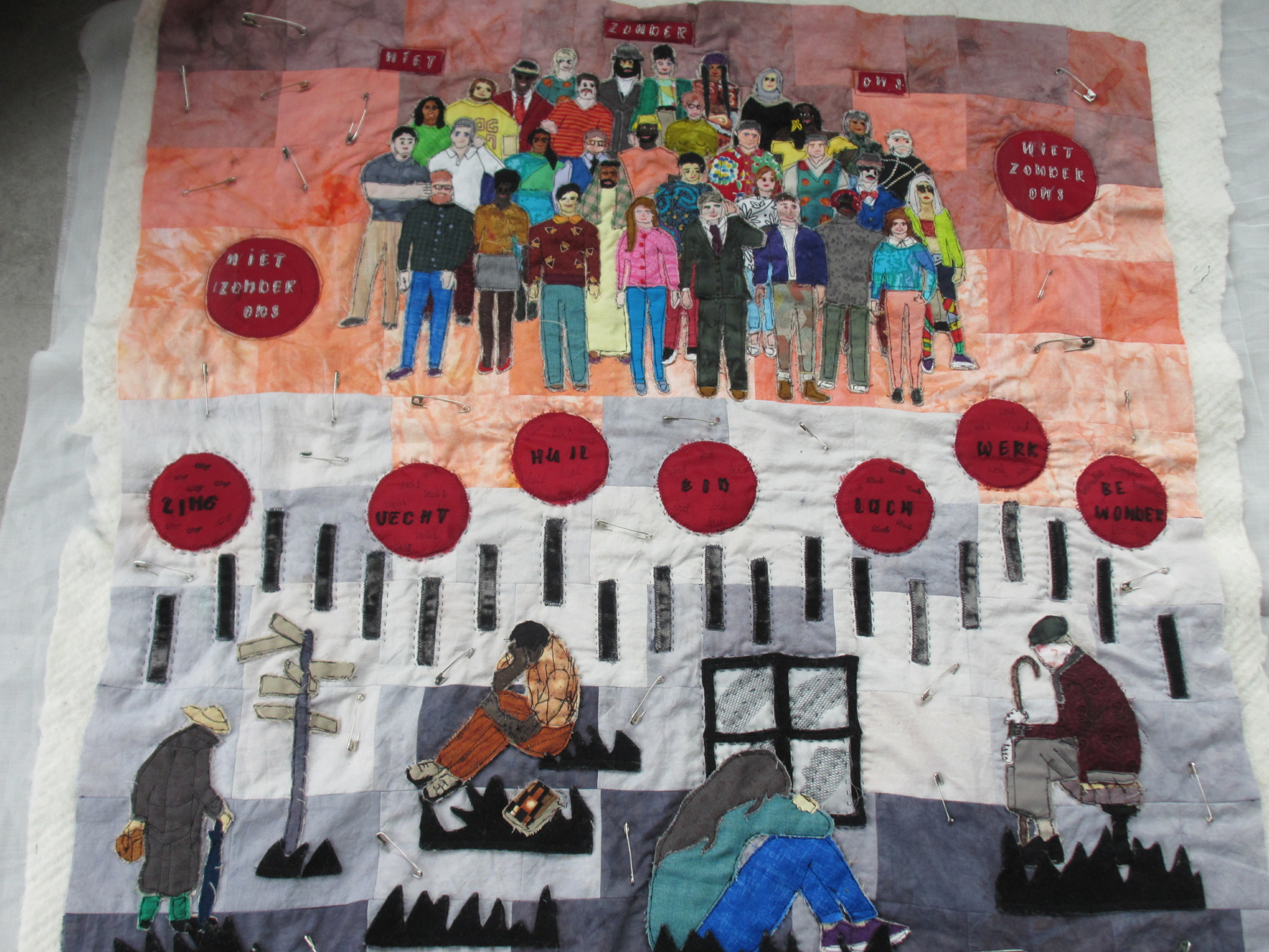 Als twee art quilters die elkaar niet kenden stapten zij in dit project. Het werken met elkaar verliep heel natuurlijk. De stappen in dit project leidden hen via kennismaking naar een persoonlijke tekst. Door veel mailtjes over en weer en een frisse blik op elkaars werk kwam het tot een quiltontwerp. Uiteindelijk werken beiden dit ontwerp uit tot een quilt.