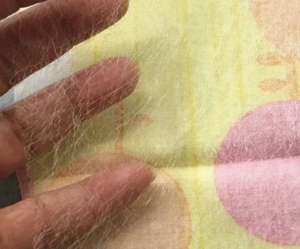Mistyfuse is zacht. Het is verkrijgbaar per meter. Bij mij wordt gauw een bolletje, een rommeltje. Om er mee te werken is het handig om de stof tussen bakpapier te strijken. Volledig laten afkoelen. Dan het te gebruiken deel op maat knippen en op de plek bevestigen samen met de bovenlaag d.m.v.strijken met een vochtige handdoek.