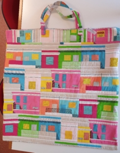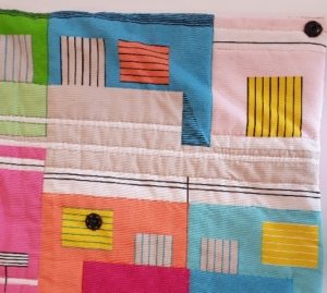 Een hoes rondom het werkstuk was niet voor iedereen logisch. Maar we hebben een paar mooie voorbeelden gezien. Diana Vandeberg had een grote ronde quilt; ze heeft een vierkante hoes genaaid en daarvan de hoeken omgeklapt door middel van een grote zwarte drukker. Zo bleef de quilt op zijn plek.