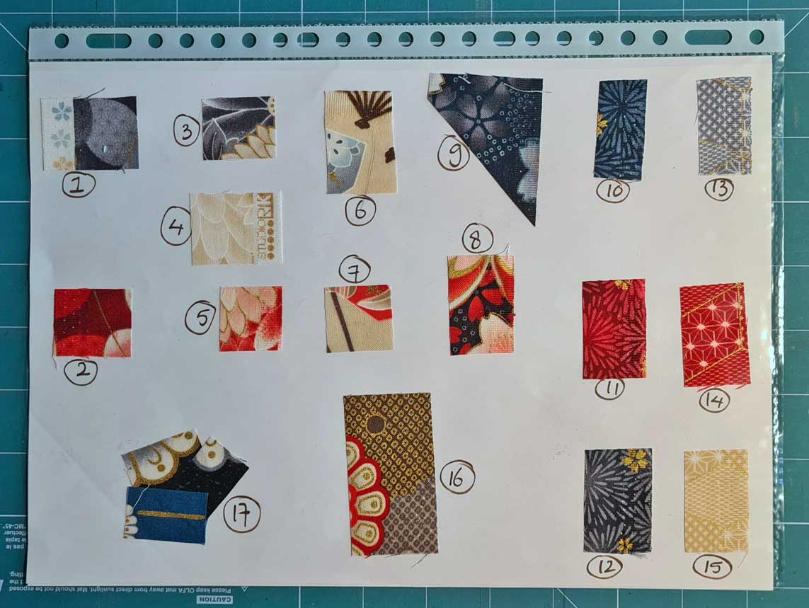 Om makkelijk aan te geven welke stof ik voor een blok nodig heb werk ik nu ook met een overzichtje van alle stoffen. Ze hebben nu nummers gekregen. Daarmee kan ik op mijn designwall per blok aangeven welke lichte of donkere kleur waar komt.