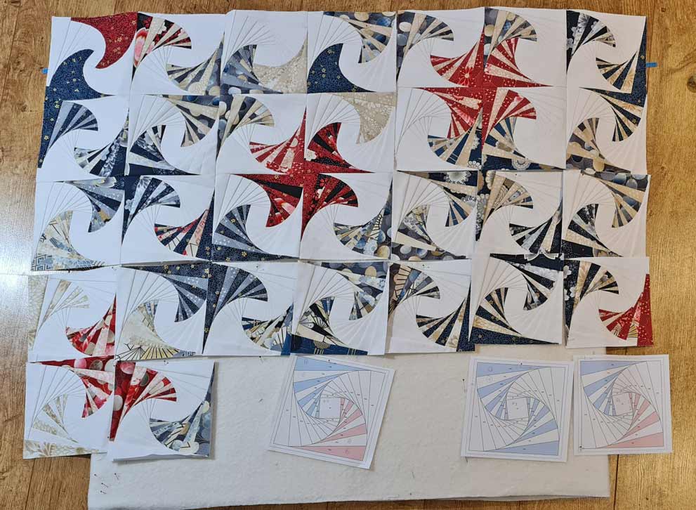 Nu ik al zo’n lekker stapeltje blokken af heb werd het ook de moeite om alvast wat aan elkaar te zetten. Daar zitten allemaal voordelen aan. De grotere vlakken zijn makkelijker te hanteren op mijn provisorische designwall. Het wordt ook beter zichtbaar hoe de blokken in elkaar overlopen. Daarbij kan ik nu ook alvast beginnen met het verwijderen van de eerste papieren achtergrondjes.