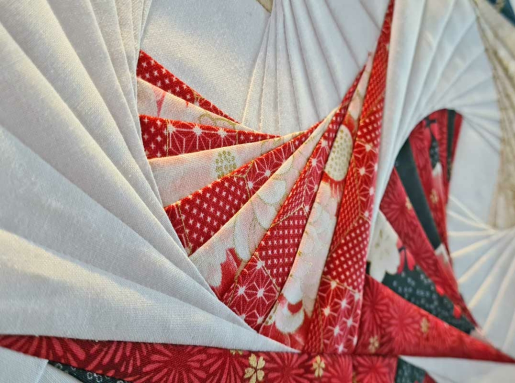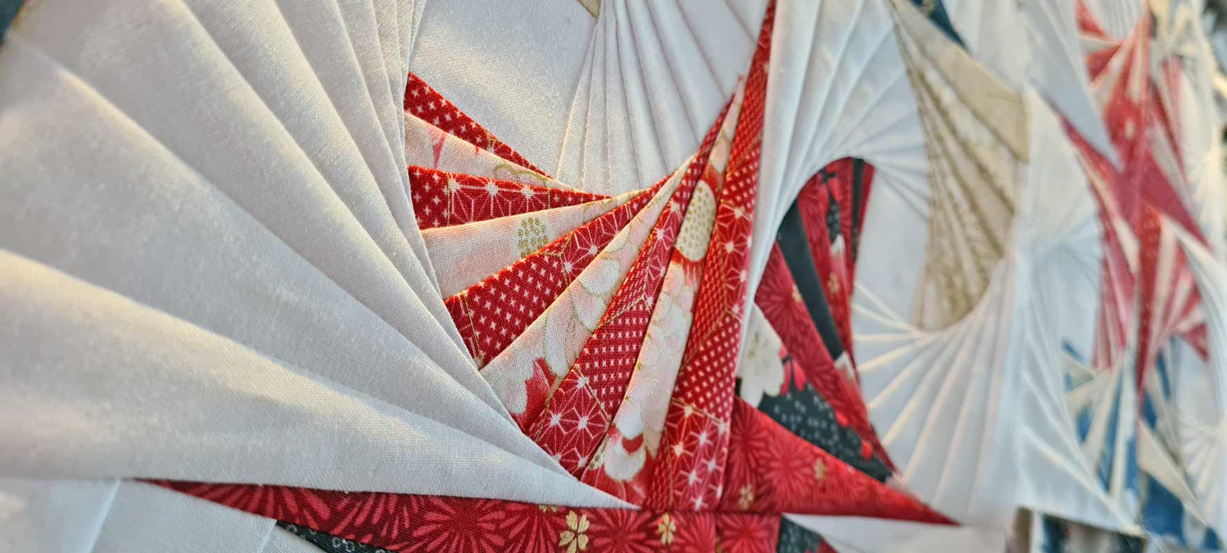 Terwijl de quilt zo langzaam groeit krijg ik ook steeds vaker een voorproefje van het eindresultaat met de twisted logcabin. Wanneer er licht op de blokken valt krijg je hele mooie schaduwen en is het waaier effect mooi zichtbaar. Dat roept ook gelijk al weer vragen op over hoe ik het straks ga doorquilten, maar nu geniet ik al intens van wat er onder mijn handen groeit.