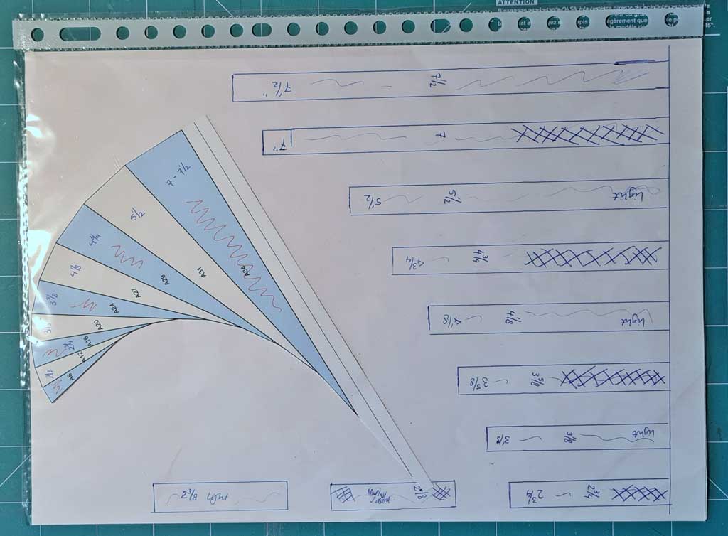 Bij het voorbereiden van de stof per blok gebruik ik deze handleiding om snel te kunnen zien of een onderdeel groot genoeg is om te kunnen gebruiken. Ik werk met jellyrolls, dus stroken van 2,5 inch breed. Met alles wat ik zo afsnij hou ik weer smallere stukken over die ik dan weer kan gebruiken bij een kleinere maat. Maar soms zijn die stroken dan net te smal of net te kort. Met dit overzicht kan ik heel snel zien of een lapje het wel of niet gaat halen.