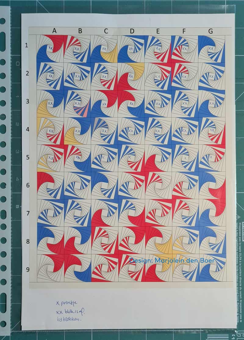 Ik had vorige keer al iets laten zien over hoe ik een ontwerp had gemaakt en het idee over kleurenverdeling was gaan aanpassen. Daar ben ik nog wat verder meegegaan en een printje helpt nu met plannen, stoffen kiezen en bijhouden welk ondergrondje al geprint klaarligt en welk blok genaaid is.