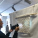 Dat is gedaan met behulp van een aluminium u-profiel. Het profiel is als ophangrail aan de muur geschroefd, met de open zijde naar boven, naar het plafond. De quilt heeft over de hele breedte geen tunnel maar een strook stof, die op een houten balkje is opgerold. Dit balkje is met stof en al daarna in het u-profiel gestoken. De quilt hangt daardoor ter breedte van het u-profiel enkele centimeters van de muur af.