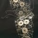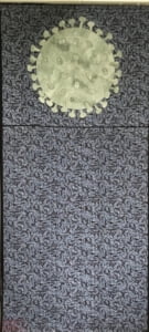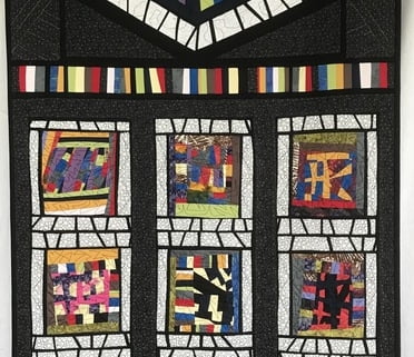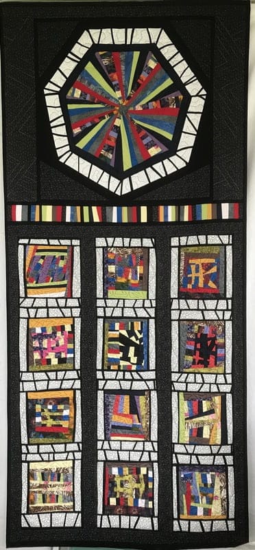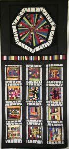 Twaalf verknipte “blokjes” moesten uiteindelijk samen iets worden en toen kwam het idee van gebrandschilderde ramen bovendrijven. Vele, vele meters zwarte strips heb ik gesneden om tussen het wit te naaien.