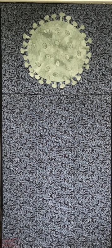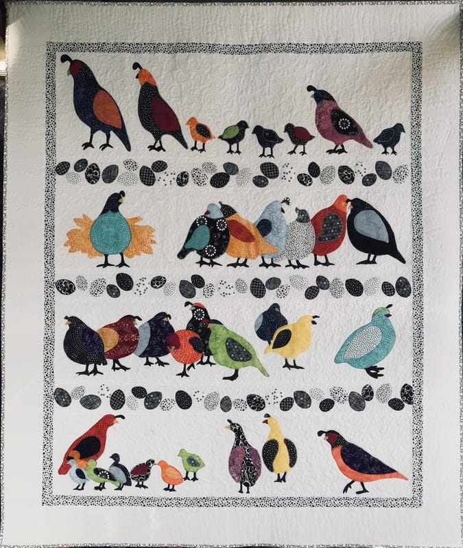 De quilt met de patrijzen (A Gathering, 120 x 145 cm) is een ontwerp van Barbara Persing. In het voorjaar van 2020 gesandwiched, maar pas vorige week gequilt; een Affo dus.