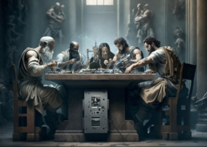 Recentelijk kreeg ik een opdracht om een afbeelding te maken van Leonardo da Vinci, Michelangelo, een derde persoon en twee kompanen. Dan werkt Midjourney helaas niet zoals de grappige hond in het vorige plaatje. Na zeker 50 pogingen, en het gebruik van Photoshop is het me gelukt. Wat ik hiermee wil zeggen is dat specifieke afbeeldingen moeilijker zijn te maken dan het lijkt.