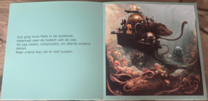 Ik heb een kleinzoon, Mats, van 2 jaar, en dacht ik, wat kan ik voor zijn 2e verjaardag geven. Na enig denkwerk ben ik een boekje gaan maken met afbeeldingen uit Midjourney en een verhaaltje. Mijn kleinzoon heeft een favoriete knuffel, zijn aap. Het moest iets worden dat hij kon begrijpen. Het werd ‘Muis Mats gaat op reis’. Muis Mats is zijn aap kwijt, en reist de hele wereld af met bus, trein, luchtballon en zo meer. En als super trotse oma ben ik blij dat het zijn lievelingsboek is geworden.