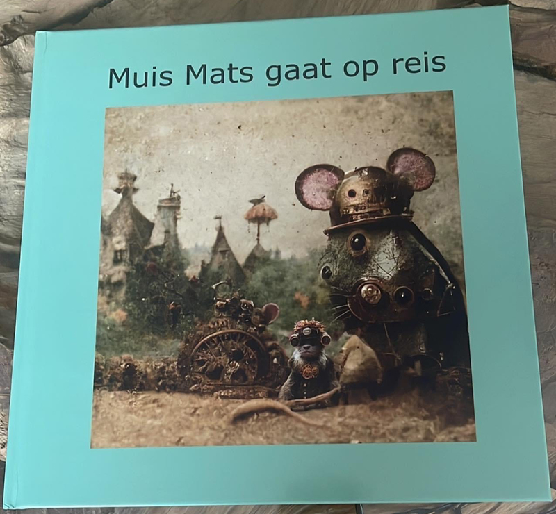 Ik heb een kleinzoon, Mats, van 2 jaar, en dacht ik, wat kan ik voor zijn 2e verjaardag geven. Na enig denkwerk ben ik een boekje gaan maken met afbeeldingen uit Midjourney en een verhaaltje. Mijn kleinzoon heeft een favoriete knuffel, zijn aap. Het moest iets worden dat hij kon begrijpen. Het werd ‘Muis Mats gaat op reis’. Muis Mats is zijn aap kwijt, en reist de hele wereld af met bus, trein, luchtballon en zo meer. En als super trotse oma ben ik blij dat het zijn lievelingsboek is geworden.