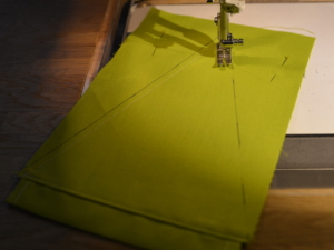 Aan de voorkant iedere keer een stukje stof ertegen aan stikken, die gelijk vast gestikt word aan de achterkant.
