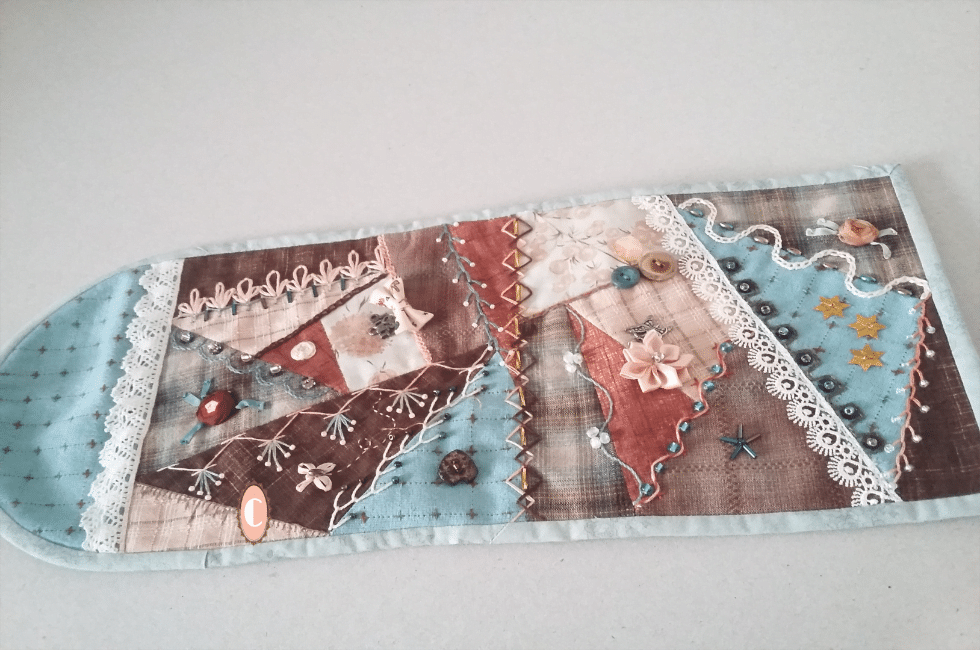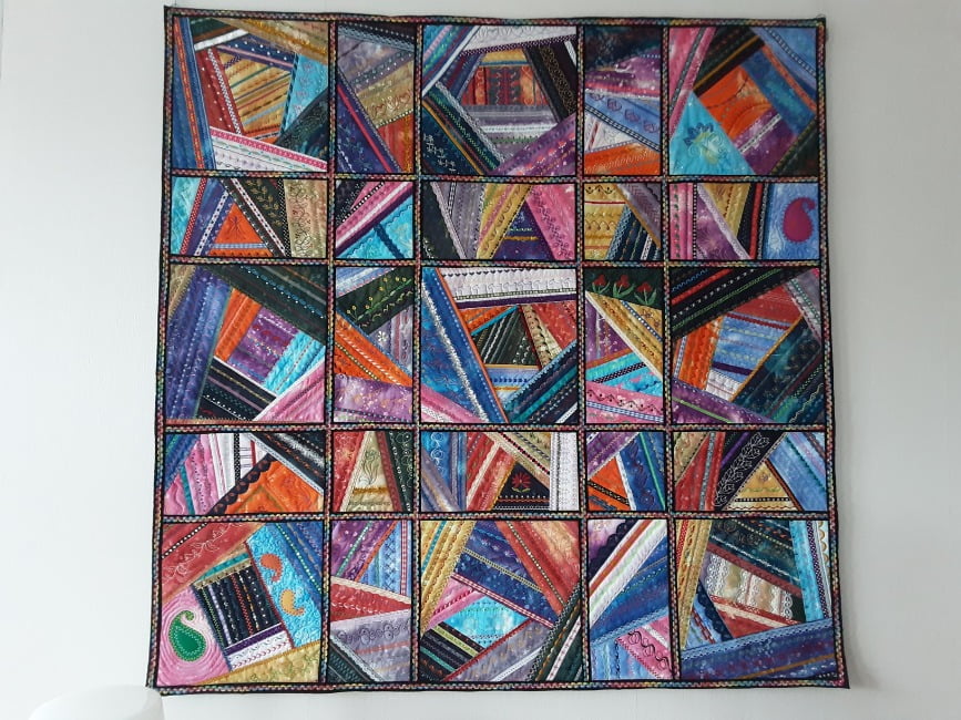 In een crazy quilt kan je heel goed restjes kwijt van andere stoffen dan katoen. Zoals gezegd, zijde, satijn, fluweel, een restje van een dierbare jurk, een stukje mooi gordijn, het kan allemaal. Je naait namelijk op een ondergrond.