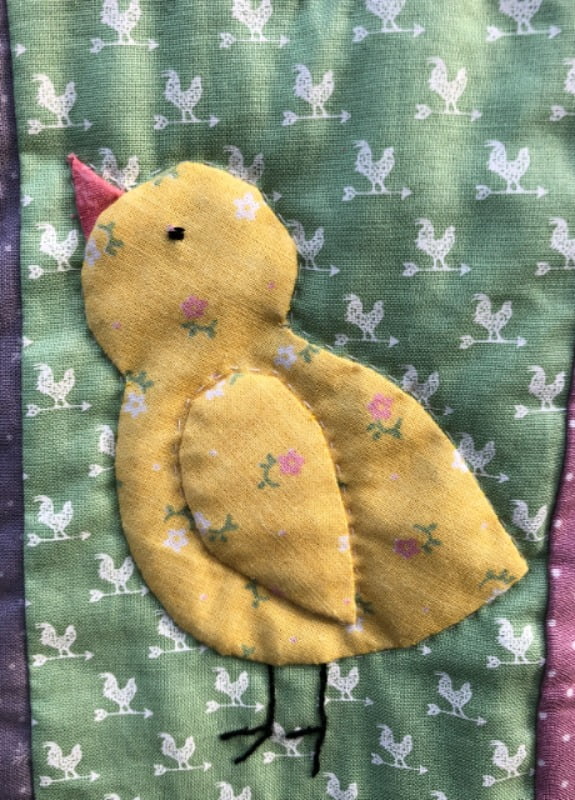 Er zijn vele patronen voor winter- en kerstquilts bekend maar voorjaars- en paasquilts zie je veel minder. Dat bracht Gerda de Jong van de Quiltnieuwsredactie op het idee om een quilt te maken met kuikentjes, eieren en een kip.