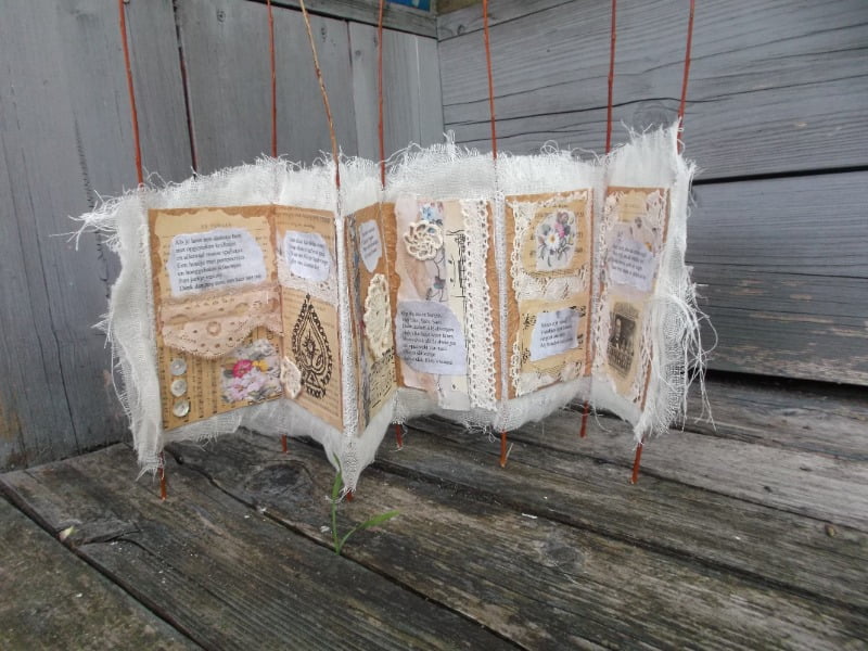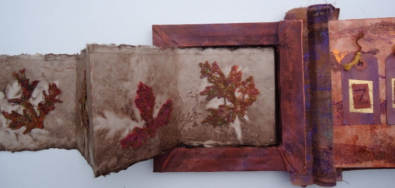 Het werken in lange banen is me goed bevallen omdat je dan kleine stukjes tegelijk kunt doen en die later aan elkaar naaien. Ik ben niet zo van de grote werkstukken. Ik maak eigenlijk het liefst kunstenaarsboeken. Gewoon kleine werkjes die snel klaar zijn.