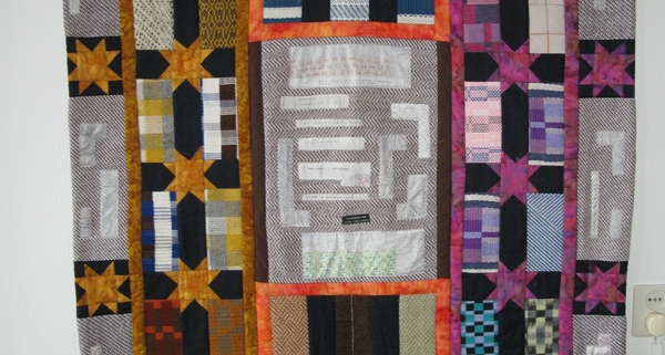 Toen de hele quilt klaar was, bleek het hoogteverschil tussen de dikke weefproeven en het katoen ertussen nogal groot. Van een oude flanellen kussensloop knipte ik repen om ertussen te leggen. Met een niet te dikke tussenvulling en de achterkant van de Guatemalalap werd het een echte quilt. Ik heb hem alleen ‘in de ditch’ doorgestikt om de weefpatronen niet te verstoren.