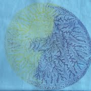 Toen ik alle lijnen gestikt had heb ik het vlies weggespoeld, de lap droog gestreken en versteviging erachter geplakt. Daarna ben ik begonnen met het inkleuren van de bloemen. Hierbij heb ik voorlopig alle draadjes en lussen van het gekleurde garen laten zitten. Afknippen kan altijd nog….