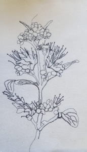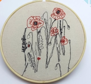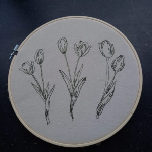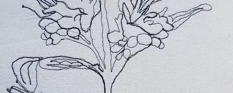 Je kunt het tekenen in een lijn doen zonder af te hechten, maar je kunt ook af en toe stoppen en je naald verplaatsen. Ik koos ervoor om in een keer de hele tak van onder naar boven te volgen.