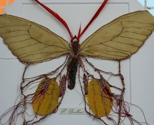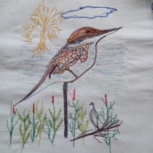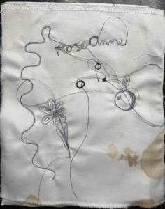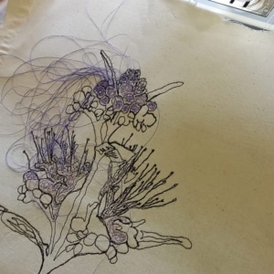 Op de afbeelding leg je oplosbaar vlies en plakt dat vast zodat het niet kan schuiven. Op dit oplosbaar vlies en met een goede pen ga je nauwkeurig alle belangrijke lijnen overtrekken van de afbeelding. Je legt daarna het oplosbaar vlies op een lapje ongebleekte katoen of een stuk damast. Spelt het vast en dan begin je alle lijnen met de naaimachine over te trekken. Riëtte werkt veel met zwart garen, maar andere kleuren kunnen ook.