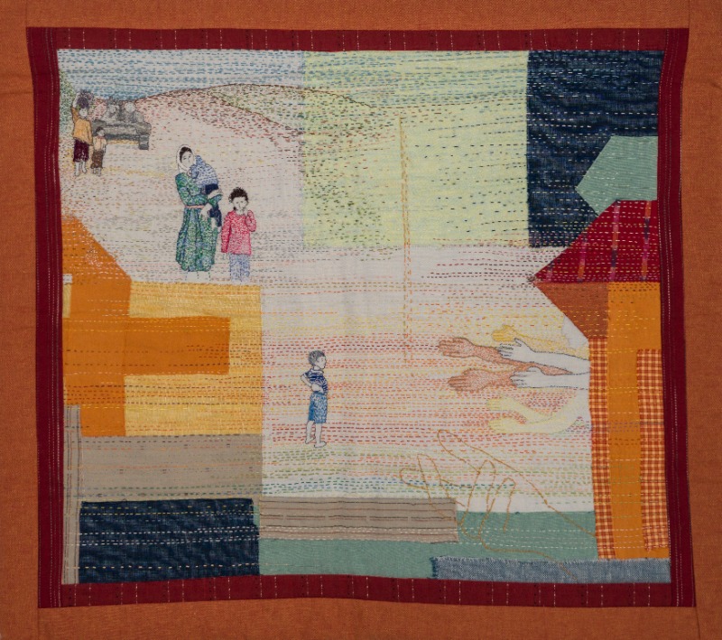 Toen ik een foto zag van een groep dansers van het Nederlands Danstheater, was dat het begin van mijn quilt. De dansers staken allemaal hun armen uit. Ik ben begonnen met het borduren van de dansers. Vervolgens ging ik me afvragen waar die armen zich naar uitstrekten, toen kwam het beeld van een kind bij me op. Dat was de tweede stap. Tijdens het borduren ging ik me afvragen hoe gastvrij ben ik/zijn wij eigenlijk. Gastvrijheid is in Nederland een belangrijk thema maar zijn we wel zo gastvrij? Wij hebben zelf een vakantie door Iran gereisd, daar hebben we ongekende gastvrijheid ervaren. We werden regelmatig bij vreemden uitgenodigd om te komen eten, het waren hele bijzondere ontmoetingen. Veel van de vluchtelingen die naar Nederland komen, zijn afkomstig uit culturen waar vreemden met open armen worden ontvangen. De Nederlandse gastvrijheid is anders. Dat contrast bleef door mijn hoofd spoken.