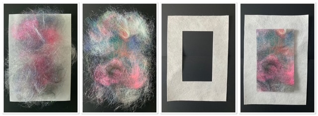 Alle kleuren door elkaar, dat ga ik doen! Speels en een beetje aan de toeval overlaten. Eerst Angeline een beetje los maken en laten vallen, dan een beetje husselen. Zo, nu pakpapier erop en strijken maar. Het plakt zo mooi aan elkaar. Het schittert!!!
