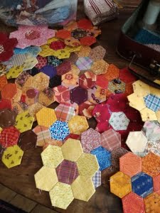 En quilten, urenlang. Momenteel werk ik aan een hexagonquilt. De quilt is geïnspireerd door een quilt uit 1821 gemaakt door Emiline Ellery, die 21 jaar oud was toen ze de quilt maakte in Newport, Rhode Island. Nu deel uitmakend van de Historic Deerfield Collection.