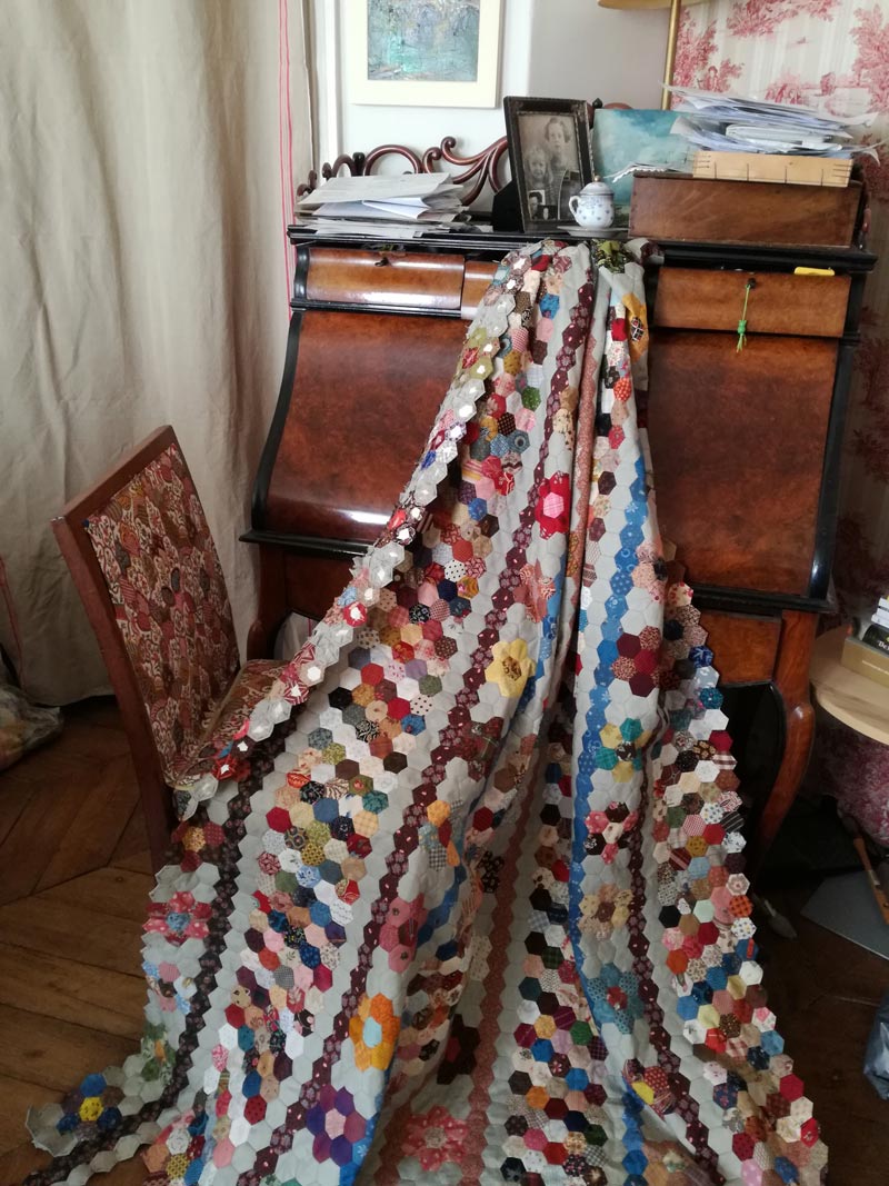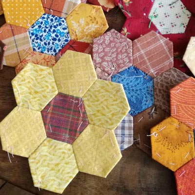 En quilten, urenlang. Momenteel werk ik aan een hexagonquilt. De quilt is geïnspireerd door een quilt uit 1821 gemaakt door Emiline Ellery, die 21 jaar oud was toen ze de quilt maakte in Newport, Rhode Island. Nu deel uitmakend van de Historic Deerfield Collection.