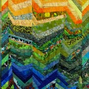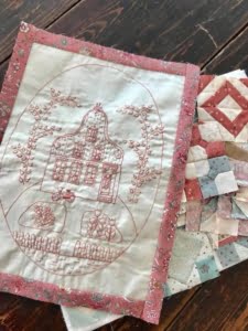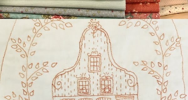 We maken in de groep de quilt ‘Zaans Huisje’ een ontwerp van Quilt it & Dotty. Het middenstuk bestaat uit een stitchery van een Zaans huisje, en daaromheen komen blokken. Het is een mysterie, dus hoe de quilt uiteindelijk wordt is nog een verrassing. Maar het eindformaat is 152 ½ cm x 162 ½ cm, en er zijn 80 blokken. Je kunt eigen stoffen kiezen, maar je kunt ook een stoffenpakket bestellen. In de originele kleurstelling maar er zijn ook andere kleurstellingen beschikbaar. Of je kiest ervoor om alleen het geborduurde middenstuk te gaan maken, dat is al een schilderijtje op zich. De materiaalpakketten en benodigdheden zijn te bestellen in de webshop