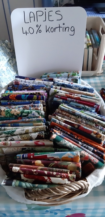 Tot zaterdag 14 juni is de kamer achter de winkel omgetoverd tot outlet. Heel veel lapjes en stoffen met 40% korting, maar ook andere artikelen, zoals kleding, handdoeken, tafellakens en meer.