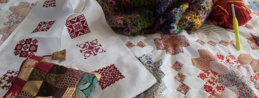 Maar ik ben nu sinds kort weer wat breder aan het handwerken. Sinds 20 jaar dit niet meer gedaan/gekund te hebben ben ik weer aan het haken (omslagdoek) en aan het borduren (de zes x zes blokjes van Soed idee/Klossie), straks verder met blokje 11. Dit wordt ook een quilt, maar ga die naar mijn eigen ding vermaken…