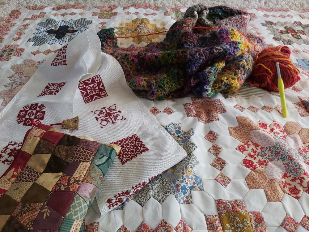 Maar ik ben nu sinds kort weer wat breder aan het handwerken. Sinds 20 jaar dit niet meer gedaan/gekund te hebben ben ik weer aan het haken (omslagdoek) en aan het borduren (de zes x zes blokjes van Soed idee/Klossie), straks verder met blokje 11. Dit wordt ook een quilt, maar ga die naar mijn eigen ding vermaken…