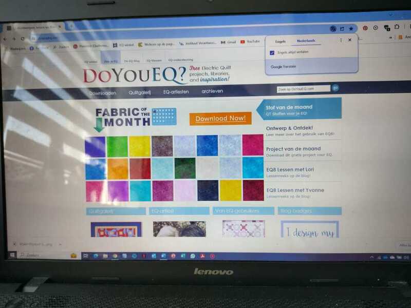 Inmiddels ben ik superblij met EQ8 en ook met de extra informatie die je kunt krijgen. Via de nieuwsbrief krijg je allerhande interessante zaken binnen. Iedere maand staat er een blok in de schijnwerpers, kun je nieuwe stoffen downloaden en/of een instructieles over een bepaald onderwerp lezen. Je kunt op https://doyoueq.com heel wat projecten en blokken (uit het verleden) downloaden en invoegen in de bibliotheek van EQ. Als ik ergens in vast loop kan ik via ‘support’ direct chatten (wel met tijdsverschil rekening houden) met een medewerker in Amerika. Na de chat krijg je de informatie in een mail toegezonden. Zo heb ik al heel wat probleempjes opgelost. Ik doe iedere maand mee met ‘block in the spotlight’. Je wordt uitgedaagd om ‘gereedschappen’ in EQ8 te verkennen en te gebruiken. Je resultaat kun je uploaden en de reacties op het ingestuurde lezen. Er zijn ook ‘At home’ lessen (classes) beschikbaar via ElectricQuilt. Door zoeken, speuren, informeren en uitproberen had ik al zoveel geleerd dat ik meteen de 3e class Master skills kon doen. Deze lessen zijn video’s met ondertiteling en je kunt het in je eigen tempo volgen of herhalen zo vaak als je wilt. Dit vind ik wel een voordeel in vergelijking met groepslessen of een workshop. En de Engelse teksten worden in de computer weer vertaald. Wel blijft de Engelse versie er naast belangrijk omdat het programma in het Engels is.