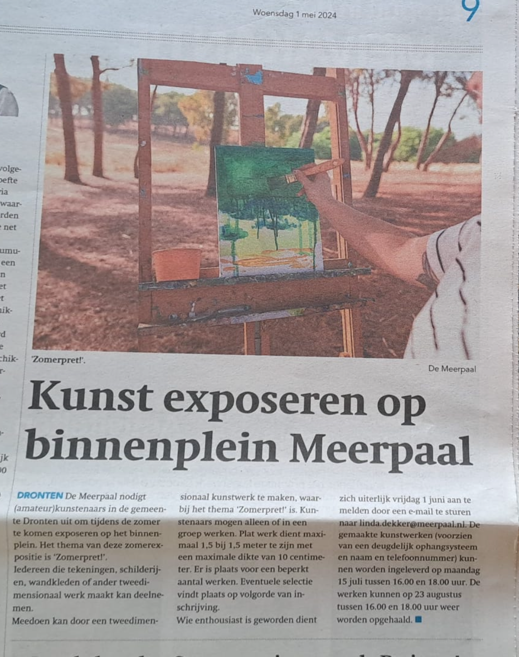 In onze plaatselijk krant De Flevopost stond een oproep aan de kunstenaars in Dronten om tijdens de zomervakantie een expositie samen te stellen op het binnenplein van De Meerpaal.