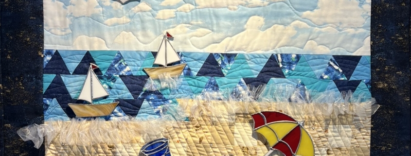 Algauw kreeg ik een appje van vriendin Jenny Rijk of het een idee was om samen een ‘kunstwerk’ te maken. Jenny haar hobby is voorwerpen van glas-in-lood maken. Haar idee was dat ik een quilt zou gaan maken en zij wat ornamentjes van glas-in-lood en dan in de quilt hangen. Dat vond ik een heel leuk idee. We zijn gaan sparren en zoeken op Pinterest. Het thema moest ‘Zomerpret’ zijn. Het ‘kunstwerk’ mocht niet groter zijn dan 1.50 x 1.50 en niet dikker dan 10 cm.