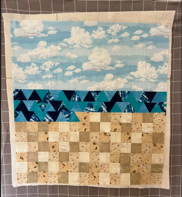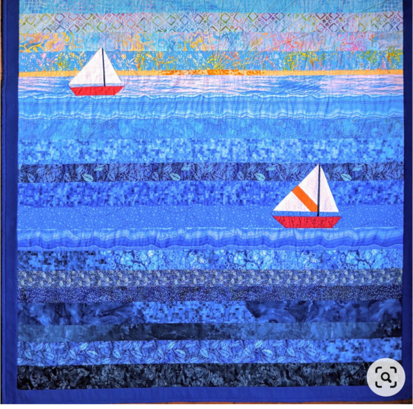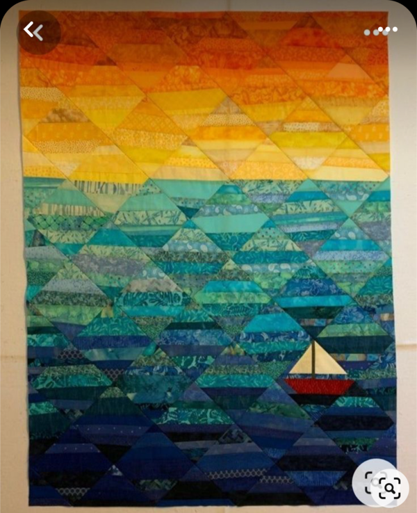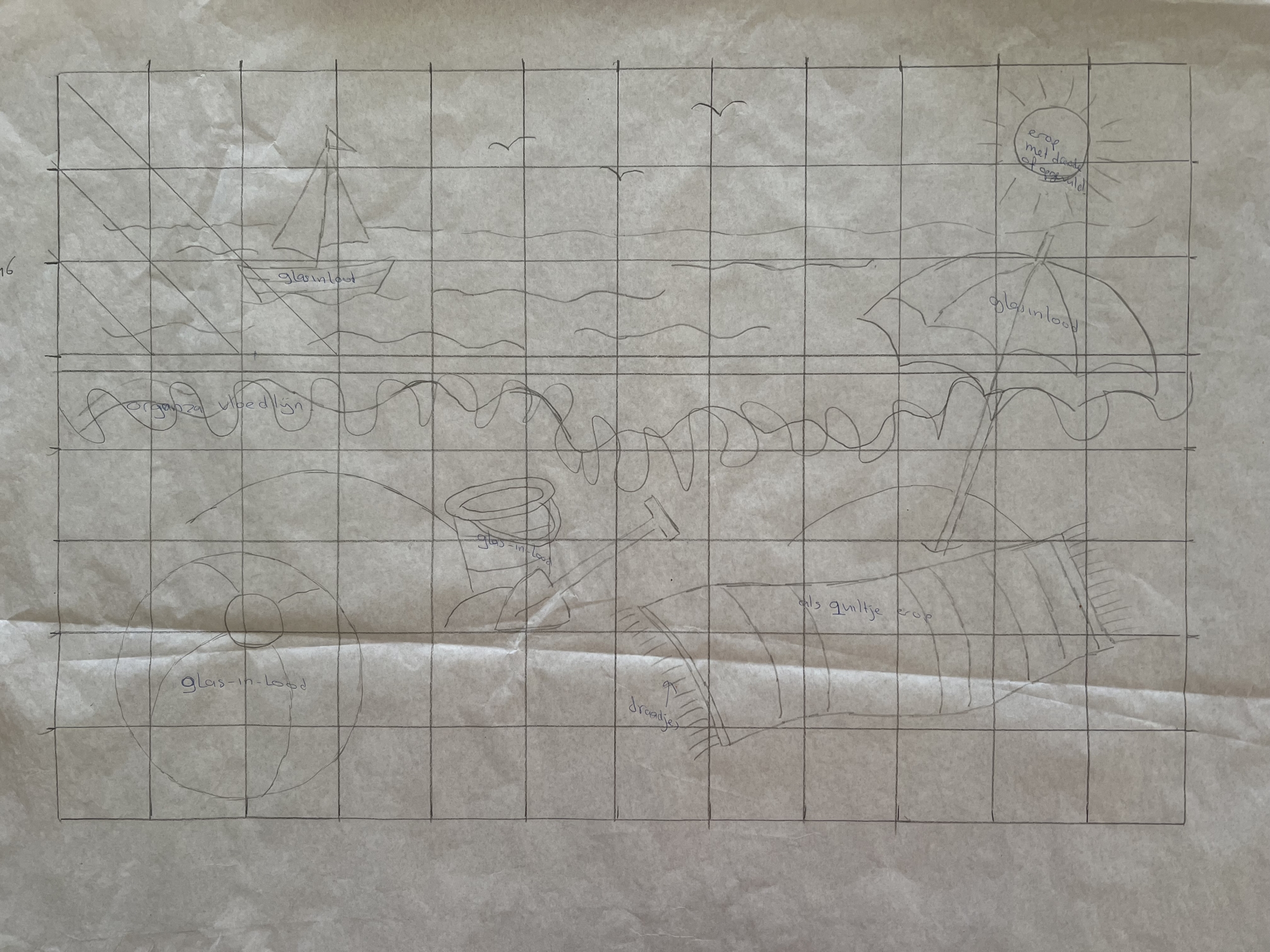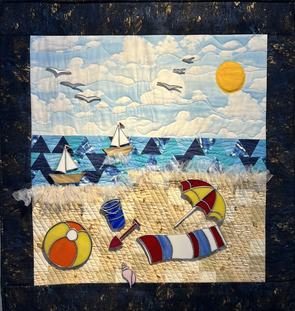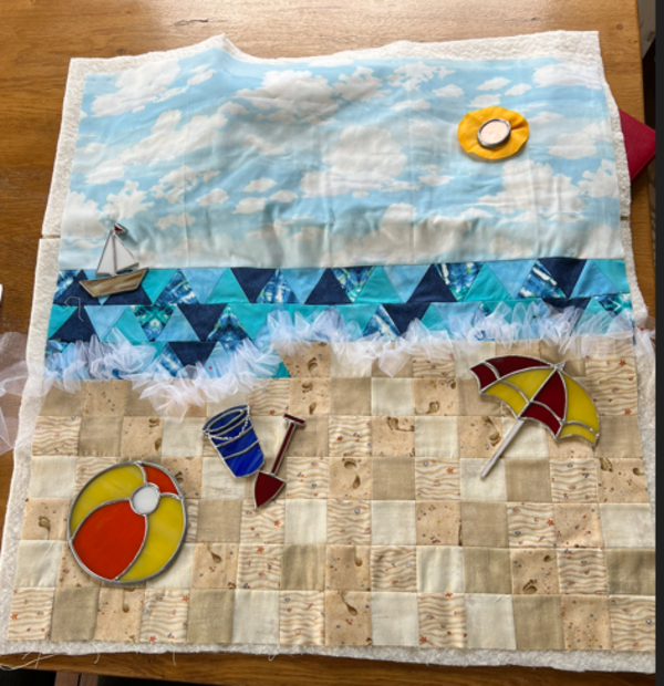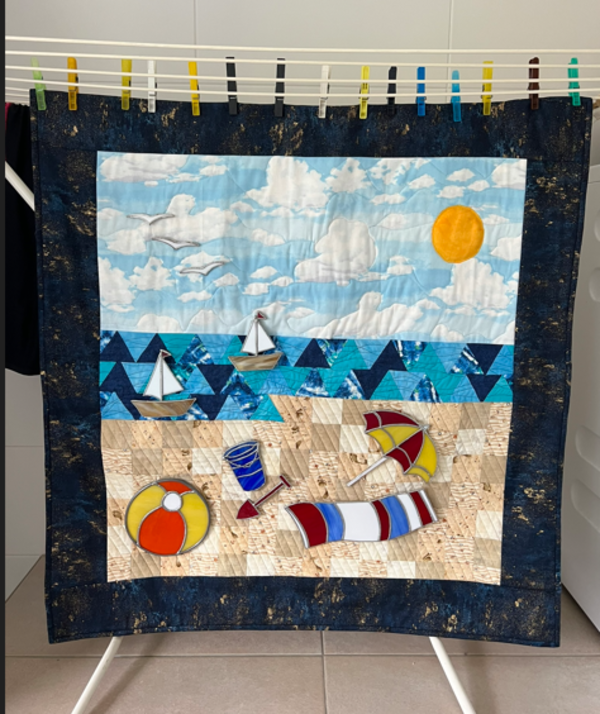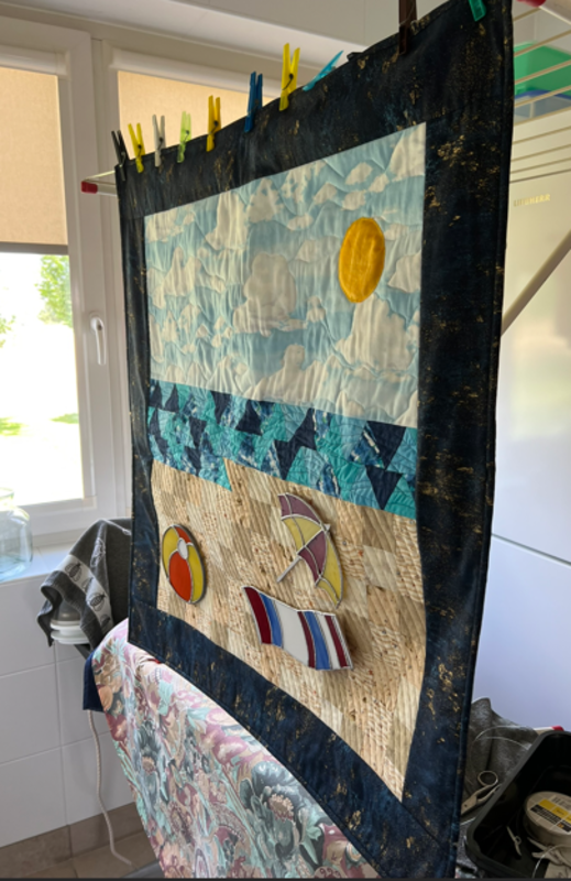 Algauw kreeg ik een appje van vriendin Jenny Rijk of het een idee was om samen een ‘kunstwerk’ te maken. Jenny haar hobby is voorwerpen van glas-in-lood maken. Haar idee was dat ik een quilt zou gaan maken en zij wat ornamentjes van glas-in-lood en dan in de quilt hangen. Dat vond ik een heel leuk idee. We zijn gaan sparren en zoeken op Pinterest. Het thema moest ‘Zomerpret’ zijn. Het ‘kunstwerk’ mocht niet groter zijn dan 1.50 x 1.50 en niet dikker dan 10 cm.