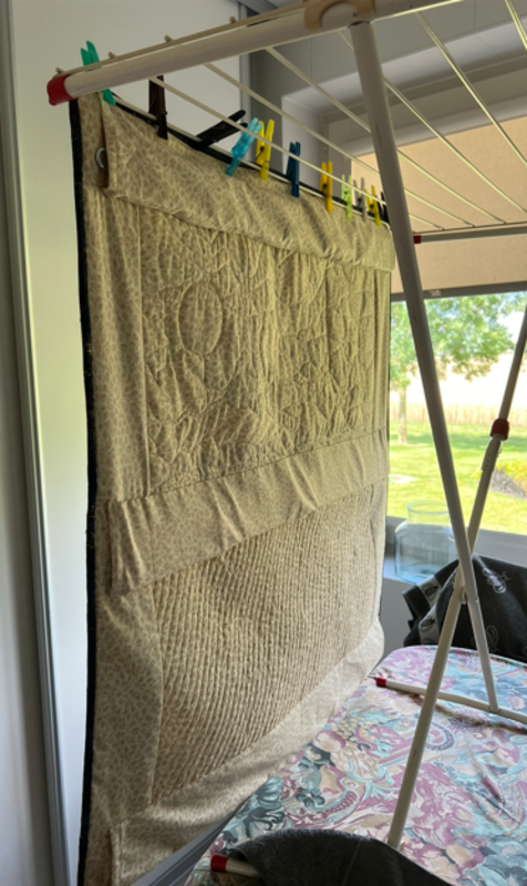 De quilt met heel veel knijpers aan het wasrek gehangen en op de strijkplank gezet. Zo hebben wij samen de ornamenten kunnen bevestigen.