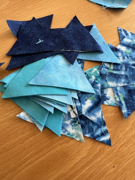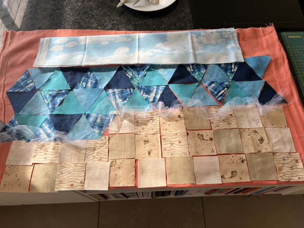 Zittend op een kruk heb ik de organza op de vloedlijn genaaid, was nog even lastig om te doen op een hangende quilt.